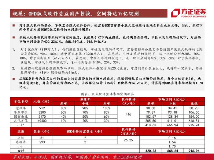 2、OFD文档软件市场:国产替代+软件正版化的趋势加剧,替换空间即使保守估计也将达到420亿元,公司作为标准制定者之一,天然拥有先发优势,在参股福昕鲲鹏下,将率先享受替换红利 ;