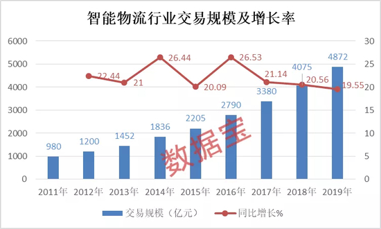根据网经社发布的《2019年度中国物流科技行业数据报告》显示,中国已成为全球第一快递大国,物流朝着多元化、智能化、开放化、国际化方向发展。2019年,智能物流市场规模约为4872亿元,同比2018年的4075亿元增加了19.55%。与以往几年的同比增长幅度相比,处于低位。如果按照这个增长幅度保守估计,预计2020年智能物流交易规模将超5800亿。