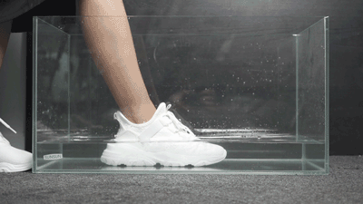 并且在灌水的情况下,里面的“汗液”会穿透飞织层聚成水珠,再从鞋面流出去!