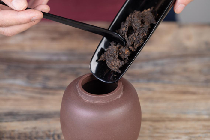 随后投茶,投茶要快,以免壶温降低,尔后合上壶盖一会,让壶体的温度慢慢地传递到茶叶,茶叶受温杂味自然就容易释出,这样也是在唤醒茶的活性,或谓之醒茶。