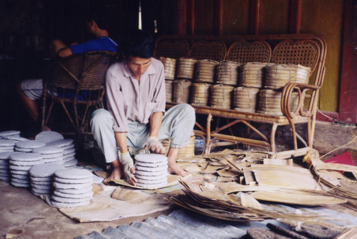 每一摞七子饼茶均用竹箬包装成筒。这种竹箬用云南产的大竹子上的笋干外壳制成,自然清香,透气性好,用竹箬包装的茶叶在运输途中不易破碎损坏,同时竹箬还能防湿、过滤杂味。