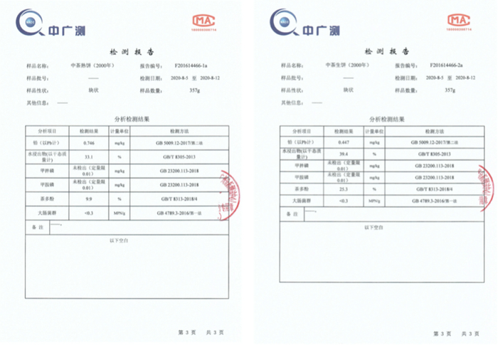 普洱质检报告 左:2000年7262熟普 右:2000年青饼生普