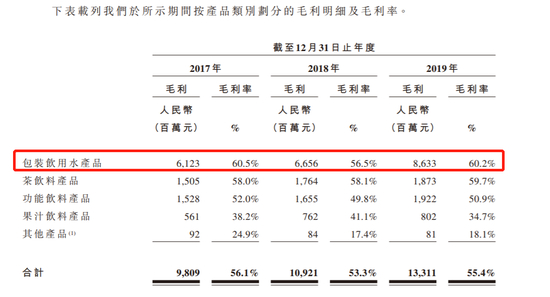 卖水有多赚钱?根据招股书,公司2019年包装饮用水毛利率高达60.2%,茶饮料和功能饮料的毛利率也超过了50%。这也意味着,我们常喝的农夫山泉矿泉水,每1元钱的销售收入可以给农夫山泉带来6毛钱的毛利。