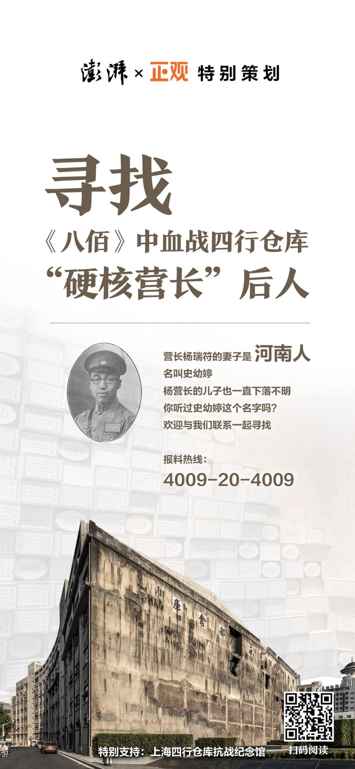 如果您有杨瑞符遗孀史幼婷及其儿子或亲属的相关消息和线索,请及时联系上海四行仓库抗战纪念馆,或者拨打澎湃新闻报料热线:4009-20-4009、邮箱: news@thepaper.cn。