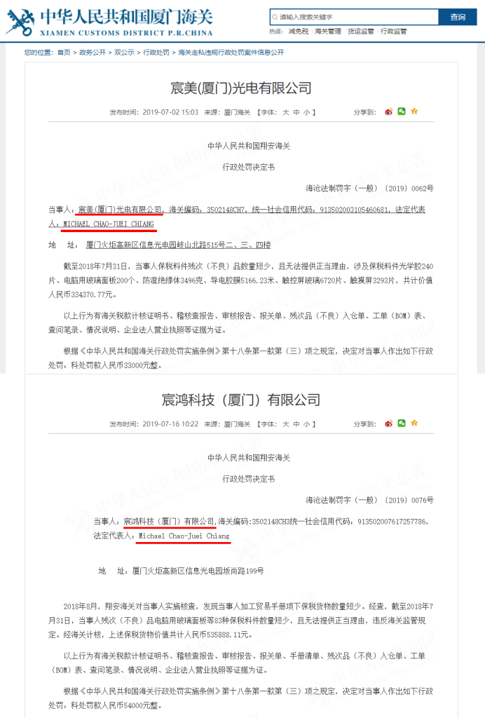 2018年8月,翔安海关核查发现,宸鸿科技残次(不良)品电脑用玻璃面板等83种保税料件数量短少,且无法提供正当理由,保税货物价值共计53.59万元。因此,翔安海关对宸鸿科技处罚款5.40万元。