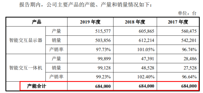 因此,在2018年末,宸展光电的智能交互显示设备产能已达到73万台,但招股书却称,公司2019年产能为68.40万台,较真实产能至少少了4.60万台。
