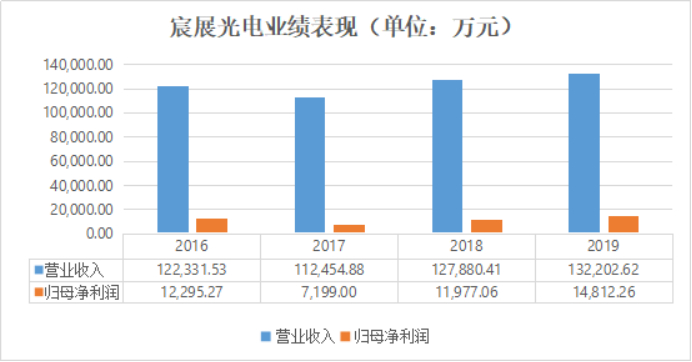 从经营业绩看,2017年~2019年,宸展光电的营业收入分别为11.25亿元、12.79亿元和13.22亿元,年化复合增长率为8.43%;公司归母净利润分别为7199万元、11977.06万元和14812.26万元,年化复合增长率为43.44%,经营成长性看似不错,实际上净利润在2017年大幅下挫四成,直至报告期末才恢复至2016年水平。