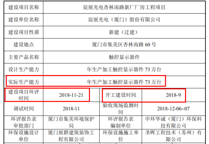 另据厦门市集美区生态环境局披露,2019年1月,集美区环保局对宸展光电的“杏林南路新厂厂房工程项目”作出竣工环保批复。竣工验收报告显示,该项目于2018年12月进行验收现场监测,公司实际生产能力为年生产加工触控显示器件73万台,与设计产能一致。