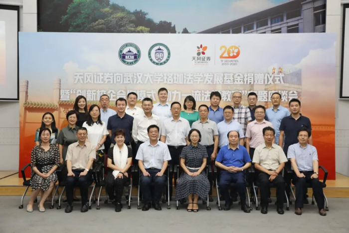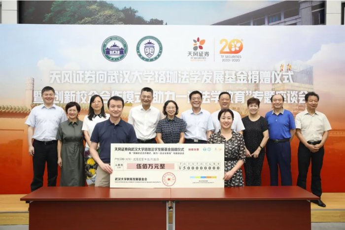 中国经济周刊-经济网讯 9月8日下午,《天风证券向武汉大学珞珈法学发展基金捐赠仪式暨“创新校企合作模式,助力一流法学教育”专题座谈会》在武大法学院举行,天风证券(601162.SH)向珞珈法学发展基金一次性捐赠500万元,主要用于包括金融法治人才培养、师资队伍建设、教学科研、学科建设等法学院教育事业发展。这不仅是有着武大基因的天风人回馈母校、献礼教师节之举,更是天风证券积极深入参与资本市场法治基础制度建设工作的重要探索。武汉大学副校长吴平、天风证券董事长余磊出席活动并讲话,武大校友事务与发展联络处处长邓小梅与天风证券总裁王琳晶代表双方签署捐赠协议,武大法学院党委书记孙德元主持会议,法学院院长冯果介绍珞珈法学基金情况,天风证券执委会主任、常务副总裁冯琳回顾了合作历程并展望合作方向。