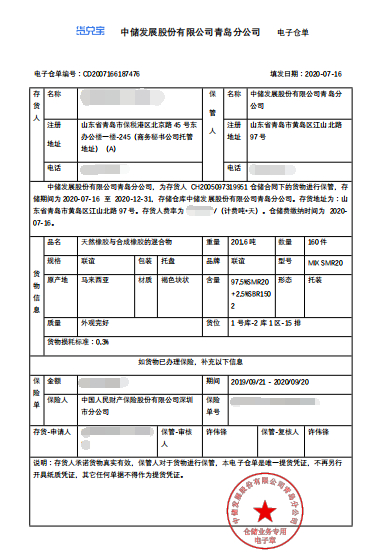 下午四五点钟左右,在经历进口货物的把关、交税、清关后,这批橡胶成功入库青岛中储,同时拥有了一张属于自己的电子仓单,并由诺顿发送给建设银行。区块链技术加持下,这张电子仓单独一无二,不可篡改,仓单的持有者则可凭借此单前往青岛中储提取货物。