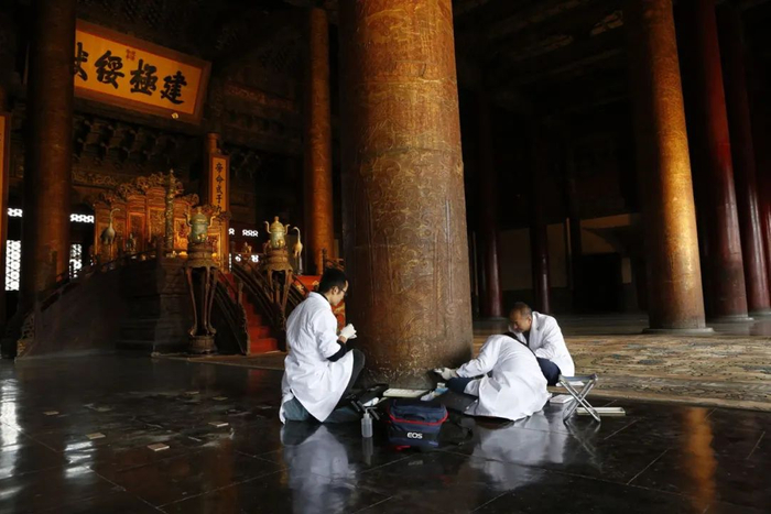 故宫修整组木器、漆器、金属等不同工艺种类的十几位老师傅,花费900多个工时,共同修复了太和殿龙椅。