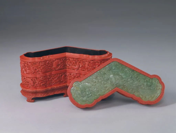 剔红嵌玉落花游鱼磬式双层盒(清)
