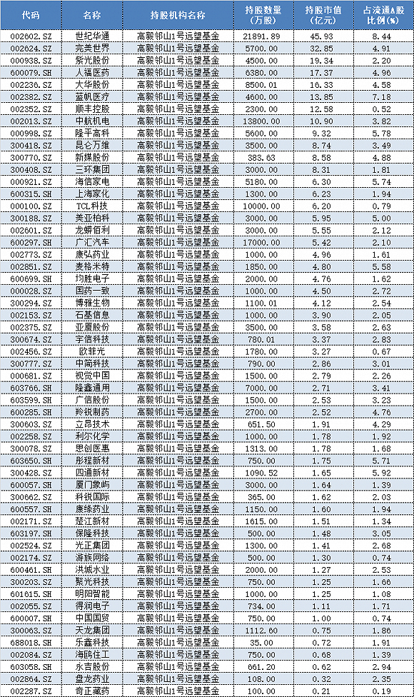 表格:“高毅邻山一号远望基金”中报持仓个股情况