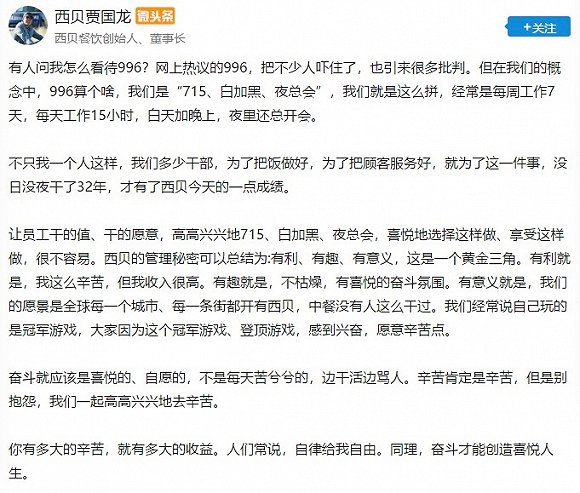 这位西贝餐饮创始人、董事长在微头条上发布了一段文字,颇具争议的一句是:有人问我怎么看待996,在我们的概念里,996算个啥,我们是“715、白加黑、夜总会”,我们就是这么拼,经常是每周工作7天,每天工作15小时,白天加晚上,夜里还总开会。