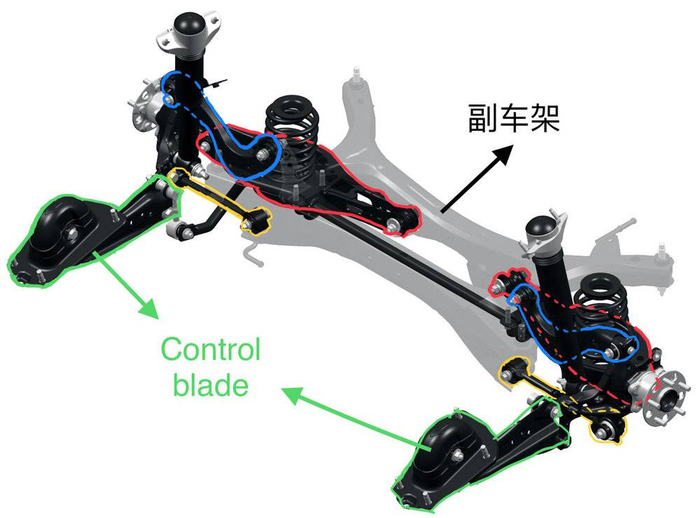 和后麦弗逊有点形似,E 形多连杆也有两个纵臂,也被称为 control blade;然而不同的是,E 形多连杆有三根彼此交错的横向连杆,车轮位置完全由三横一竖四根连杆来束缚,弹簧减振器只承担垂直方向的力,各司其职。