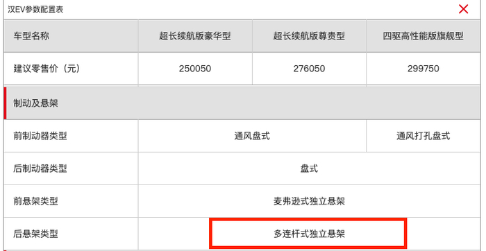 然而在车型配置表中,名字也只有三个字,“多连杆”。