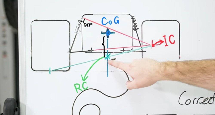 不论是为了舒适还是性能,我们都不希望车辆过弯时侧倾程度过大。车辆过弯时会向外侧侧倾,因为车辆的重心(CoG)在悬架侧倾中心(Roll center/RC)之上,二“心”的高度差越大,侧倾时的力臂越长,也就越容易发生侧倾。所以针对悬架系统而言,要减小侧倾趋势,应适当提高侧倾中心,缩短侧倾力臂。