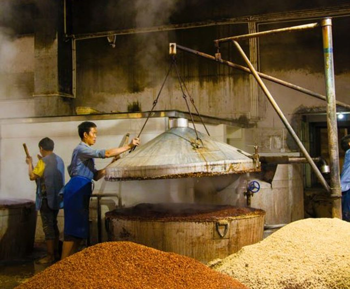 投料后开始蒸煮,因为红缨子高粱有着皮厚、支链淀粉和单宁含量高的特点,需要每隔一个月进行一次蒸煮,在一个生产周期内要反复蒸煮九次。
