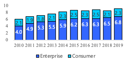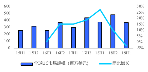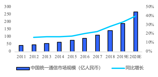 根据Frost&Sullivan在2010对统一通信的界定,统一通信是指将电话、传真、数据传输、音视频会议、即时通信等不同的通信手段相统一,以实现让人们在任何时间、任何地点,都可以通过任何设备、任何网络,获得数据、图像和声音的自由通信方式。疫情蔓延促使企业进行数字化转型,采用新的技术来支持员工在疫情期间保持高效工作,为UC市场的发展带来催化剂。按照2020年存量规模同比增长40%进行测算,中国统一通信市场规模2020年有望突破250亿人民币。