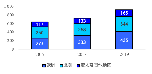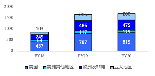 图:缤特力收入主要来自于美国(单位:百万美元)