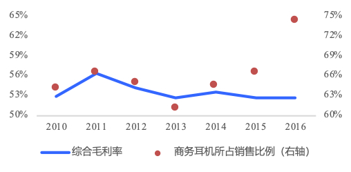 图:捷波朗毛利率与商务耳机所占销售比例正相关