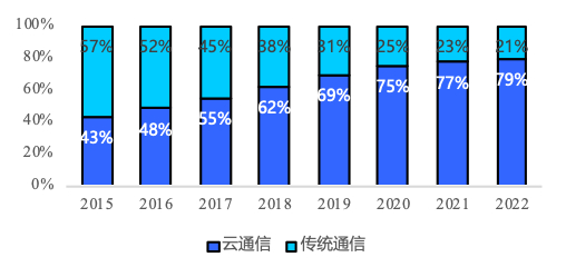 未来云通信模式将成为统一通信的主流。统一通信平台有自建式和云通信两种部署模式。不同于传统的企业自建式的统一通信系统,基于云端的模式下,企业不再需要购买昂贵的管理系统设备,只需要与统一通信服务提供商签订合约,按月支付使用费即可享受统一通信服务。该模式使得企业从过去的购买产品,转变为购买服务。这种云服务模式,在前期投入成本、维护费用、扩展性等方面均具有显著优势,帮助企业大幅削减开支。据Gartner预测2022年,云通信占全部统一通信平台的比例将达到79%。