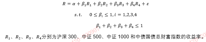 净值回归法是通过将基金净值增长率对不同的市场规模指数进行带有约束的多元线性回归,将基金的收益分解到不同指数收益上,从而得到基金仓位的估计值。模型方程及约束条件如下,其中,R为基金的复权单位净值增长率: