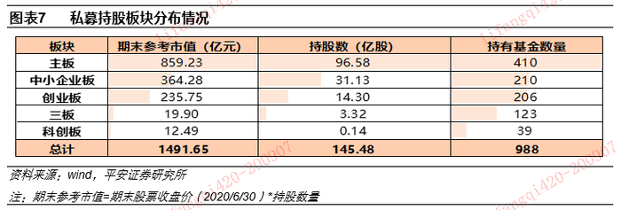 根据2020年度上市公司半年报披露的信息可以看到,共计988只私募基金出现在前十大股东中,以期末股价(2020/6/30,下同)进行测算,私募持股的参考市值约为1492亿元,持股数约为145.5亿股。其中持股参考市值及数量均以主板为主,中小板、创业板次之。
