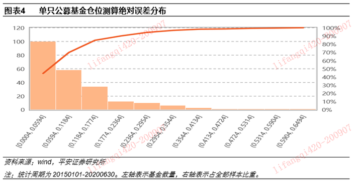 从2015年至2020年中单只基金仓位测算绝对误差的分布来看,大部分基金的仓位测算误差在6%以内,约75%基金样本仓位测算绝对误差在12%以内,但不得不承认仍有部分基金在部分时期的仓位测算误差较大。表明在仅将基金净值作为输入要素时,模型对于单基金的仓位测算可能存在偏离较大的情况,仅能作为观察基金变化趋势的参考依据。