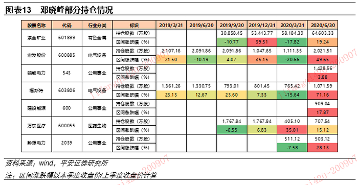 高毅旗下明星基金经理邓晓峰部分持仓情况如下,以基金首次出现在个股前十大股东明细的时间至8月末测算个股区间涨跌幅,不考虑区间增减仓的情况,可以看到个股区间涨跌幅均为正,并且持股数量最多的紫金矿业区间涨跌幅高达123%。本期出现的皖能电力、建投能源、黔源电力均为电力相关个股。