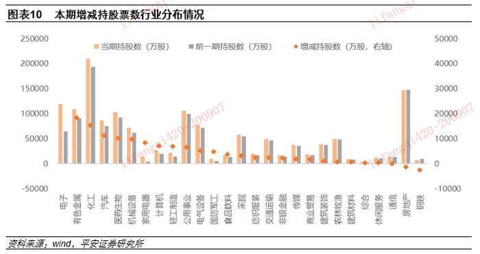 从本期增减持股票数行业分布来看,增持方向以电子、有色金属、化工为主,仅钢铁及房地产两个行业出现了持股数量的减少。