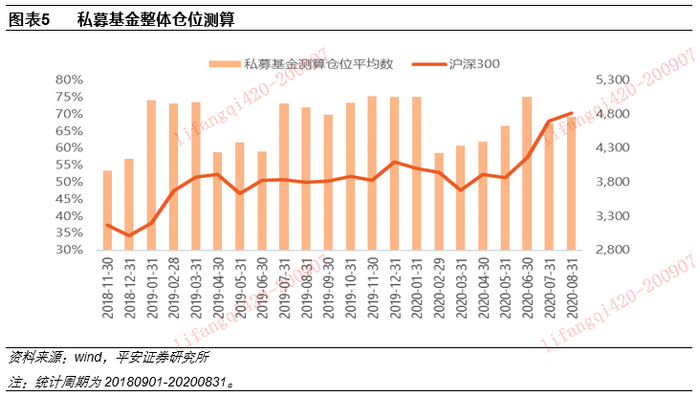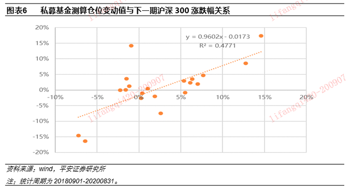 从图表5私募基金整体仓位测算结果来看,私募基金在契约约束更宽松的条件下,仓位波动较公募基金更大,平均中枢为70%左右,在部分情形下如2018年会降至55%左右。并且从仓位变化与沪深300的走势可以看到,私募基金整体仓位变化有领先沪深300走势的趋势,私募基金作为追求绝对收益的代表,在预判市场风险加大时会更加积极地降低仓位。