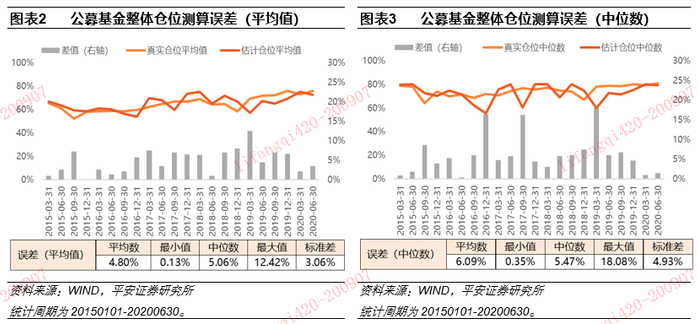 从图表2、3基金整体仓位测算误差结果来看,平均值的误差约为5%左右,中位数的误差约为6%左右,并且标准差均小于5%,表明仓位测算结果误差较小,并且误差分布总体稳定,使用该模型能较好地表征基金整体仓位情况。