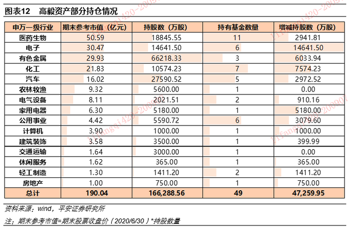 根据2020年度上市公司半年报披露的信息高毅资产共计49只基金出现在前十大股东中,以期末股价进行测算,持股的参考市值约为190亿元,持股数约为16.6亿股。其中持股参考市值最多的行业为医药生物、电子和有色金属,持股数量最多的行业为有色金属、汽车和医药生物。