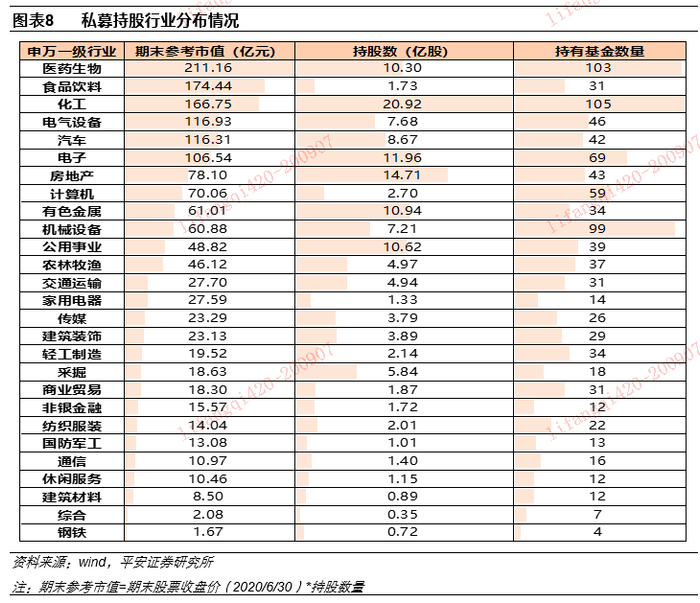私募基金持仓特点:根据2020年度上市公司半年报披露的信息可以看到,共计988只私募基金出现在前十大股东中,以期末股价(6月30日)进行测算,私募持股的参考市值约为1492亿元,持股数约为145.5亿股。其中持股参考市值及数量均以主板为主,中小板、创业板次之。其中持股参考市值最多的行业为医药生物、食品饮料和化工,持股数量最多的行业为化工、房地产和电子,持有基金数量最多的行业为化工、医药生物和机械设备。