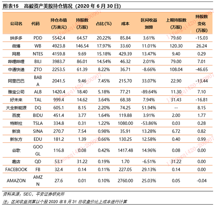 根据美国证监会披露的F13数据显示,截至2020年6月底,高毅资产旗下共计持仓17只美股,持股市值合计为2.74亿美元。从持仓情况来看,主要以中概股为主,并以互联网概念居多。标的分布较为集中,前五大重仓股合计市值为2.09亿美元,占整个美股持仓的比例为76.15%。