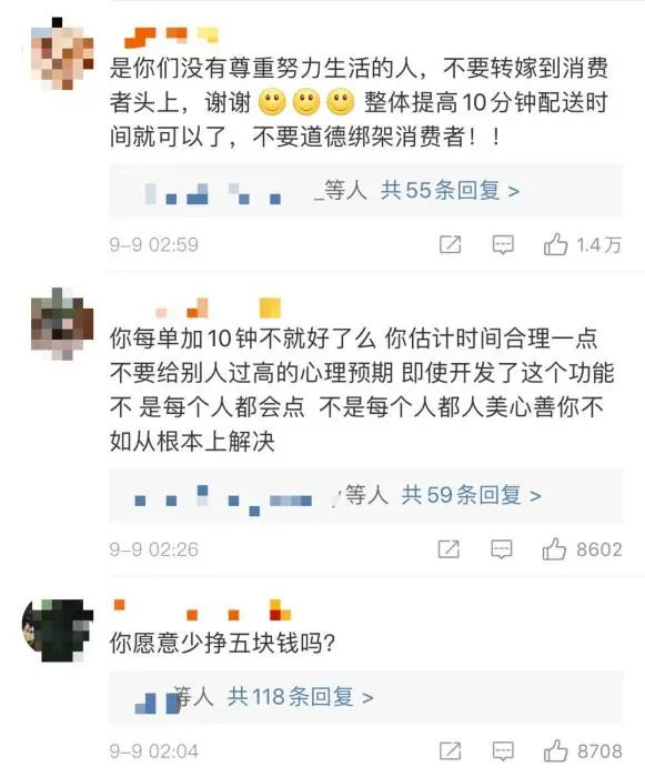 但更多人觉得,选择多等5分钟并不等同于骑手会骑慢点,反而有可能意味着相同时间内接更多的订单,对骑手也没有体现出什么好处。