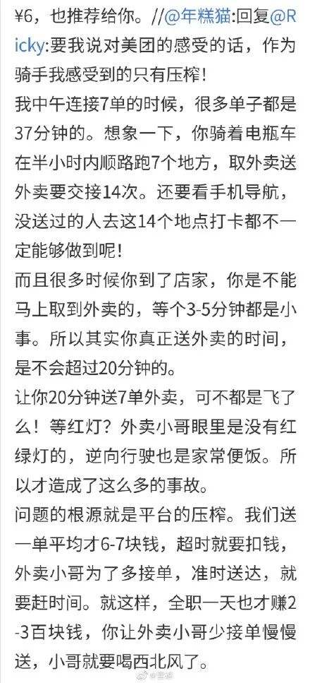沣京资本基金经理吴悦风发布微博称,算法是冷冰冰的,它一定会无限压榨整个体系的潜力,最后达到微妙的平衡,也就是所有骑手处于劳累的边缘。算法不是人,它当然没有人性,这毫无疑问。不过美团骑手的整体待遇最高、压力也是最大,这也是行业公认的。
