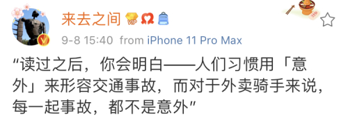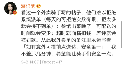 文章指出,在系统的压迫下,外卖骑手受到派送时间不合理、规划路线含逆行、商家出餐慢、超时高额罚款等问题的多重折磨,为了不被系统除名、不影响站点数据,骑手们不得不选择铤而走险,每天都在违反交规、与死神赛跑,外卖员成了高危职业。