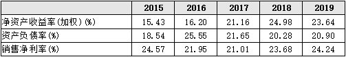 盈利能力看,低负债率基础上的高净资产收益率,说明片仔癀的盈利能力非常强。片仔癀资产负债率水平较低,2015-2019年资产负债率分别为18.54%、25.55%、21.65%、20.28%、20.9%,且多为无息负债,同时净资产收益率分别为15.43%、16.2%、21.16%、24.98%、23.64%。