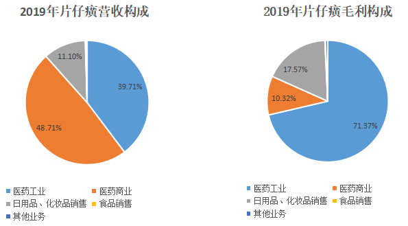 2019年片仔癀医药业务的营收占片仔癀总营收的80%以上,医药工业占公司总营收的39.71%,占公司毛利的71.37%,药业工业主要由片仔癀系列药品构成;日用品、化妆品占公司营收的11.1%,占公司毛利的17.57%;医药商业营收占比较高,利润率较低,毛利仅占10.32%。
