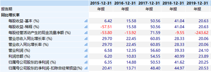 结合业绩情况看,2015至2019年片仔癀扣非归母净利润增速分别为20.41%、13.71%、48.4%、44.97%、20.53%,业绩增速水平较高。