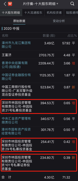 提到片仔癀不得不提林园,他被投资者尊称为“中国股神”,是片仔癀坚定的拥护者,截至2020年年中,林园旗下三款私募基金产品进入片仔癀十大股东名录,合计市值约23.4亿元(截至2020年9月3日),林园不仅是嘴上看好。