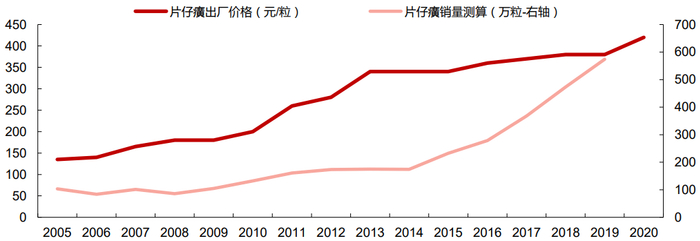 片仔癀2005年的销量约100万粒,预计2020年实现销量600万粒,2005-2020E销量的年复合增长率约12.7%,销量增速保持在较高水平。片仔癀销量于2015年开始提速,主要系公司于2014年打破原有供给瓶颈,并推出“片仔癀体验馆”,旨在宣传推广片仔癀系列药品。2005至2020年上半年,片仔癀的出厂价持续涨价,年复合提价约7.86%。
