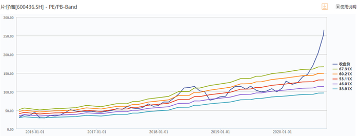 其次估值贵是最常见的未买入理由,近5年片仔癀平均动态市盈率达53.11倍,最便宜时也有38.91倍,截至2020年9月3日,片仔癀动态市盈率达108倍,这估值是否高估?
