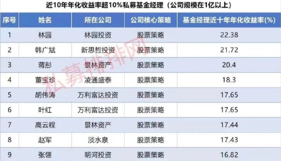 中国最近10年年化收益率超10%私募基金经理(公司规模在1亿以上)收益率排名,林园以年化22.38%收益率排第一。虽然林园曾经被投资者广泛质疑,但事实证明,林园还是配得上“中国股神”的头衔。