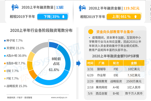 烧钱背后离不开资本支持。易观数据显示,2020年上半年在线教育融资数量13起,相较2019年下半年下降35%,但融资金额上涨661%,为119.5亿元,主要由猿辅导、作业帮完成的两笔大额融资拉升至高点。