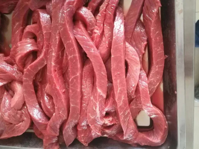 一头牛能产出500斤的牛肉,但最适合做牛肉干的只有30~50斤。这些牛肉有个好听的名字叫米龙,指的是牛后腿外侧的臀尖肉。