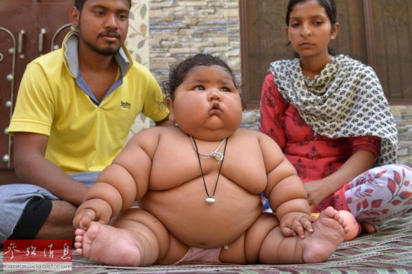 资料图:在印度阿姆利则,女孩查哈特(中)和父母在家中。查哈特只有8个月大,体重据报道超过17公斤。(新华社/法新)