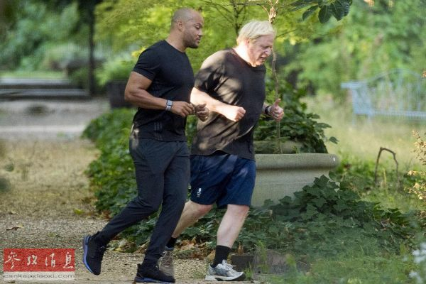 资料图片:英国首相鲍里斯·约翰逊(右)和他的教练哈里·詹姆森在慢跑。(英国《泰晤士报》网站)